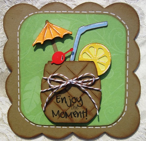 Can you see the little weiners sizzling on the grill? For my butterfly I used Pooh and Friends Cricut cartridge. This is one of my favorite butterflies. There are some real hidden gems on this cartridge. You should check it out. I added a little stitching for a flight patterned effect. The "grass" comes from Everyday Paper Dolls Cricut cartridge but it really isn't the grass it is the sand! I used the hide contour feature on my Gypsy to hide all the little dips and grains of sand. I just liked the gentle curve and thought it made nice grass.